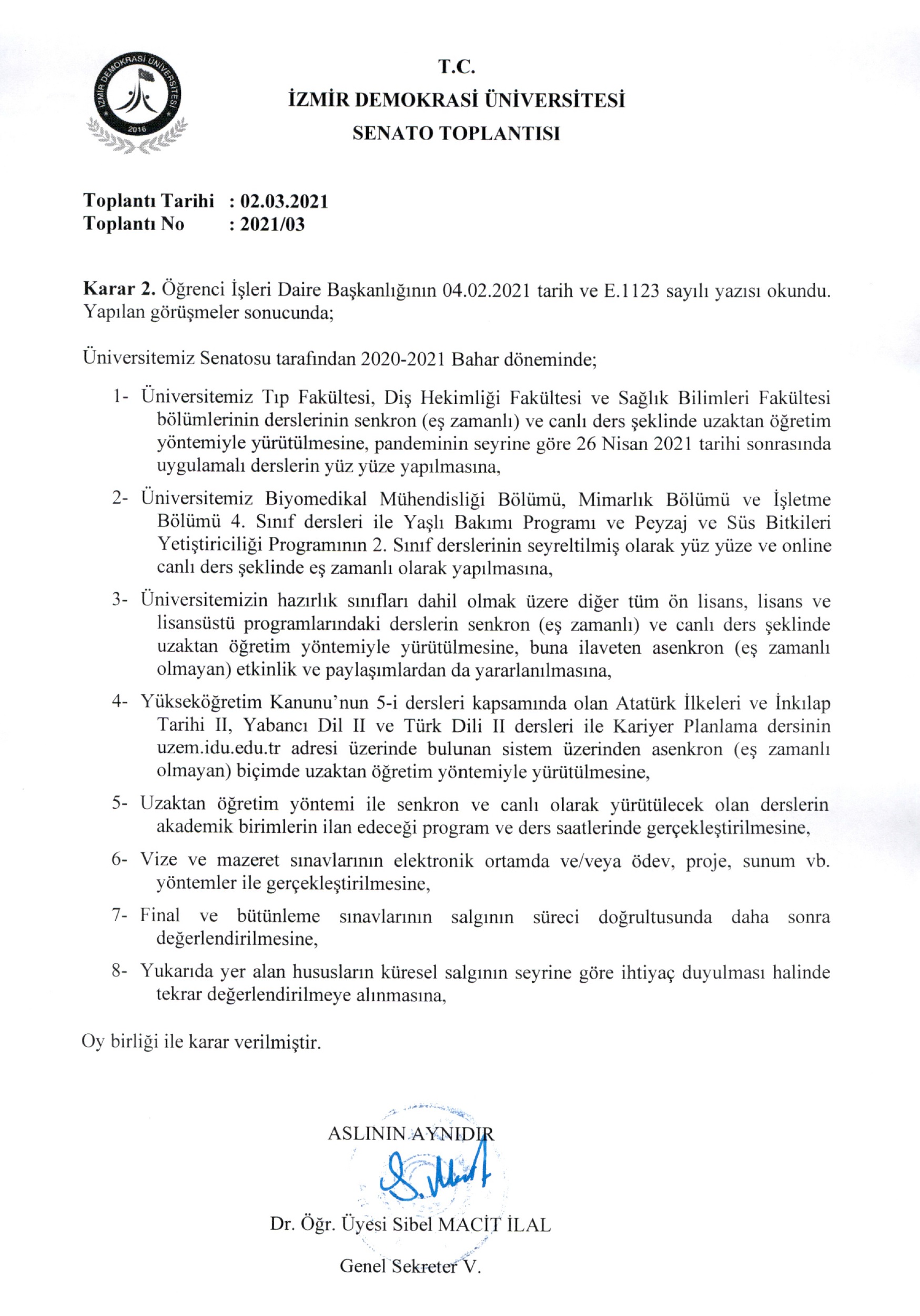 2020-2021 Eğitim Öğretim Dönemi Bahar Yarıyılı Senato Toplantısı Kararları