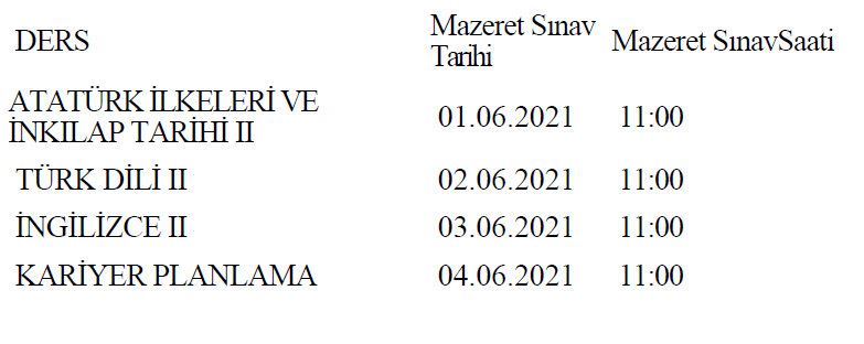 2020-2021 Bahar Dönemi Ortak Zorunlu Dersler Mazeret Sınav programı aşağıdaki gibidir.
