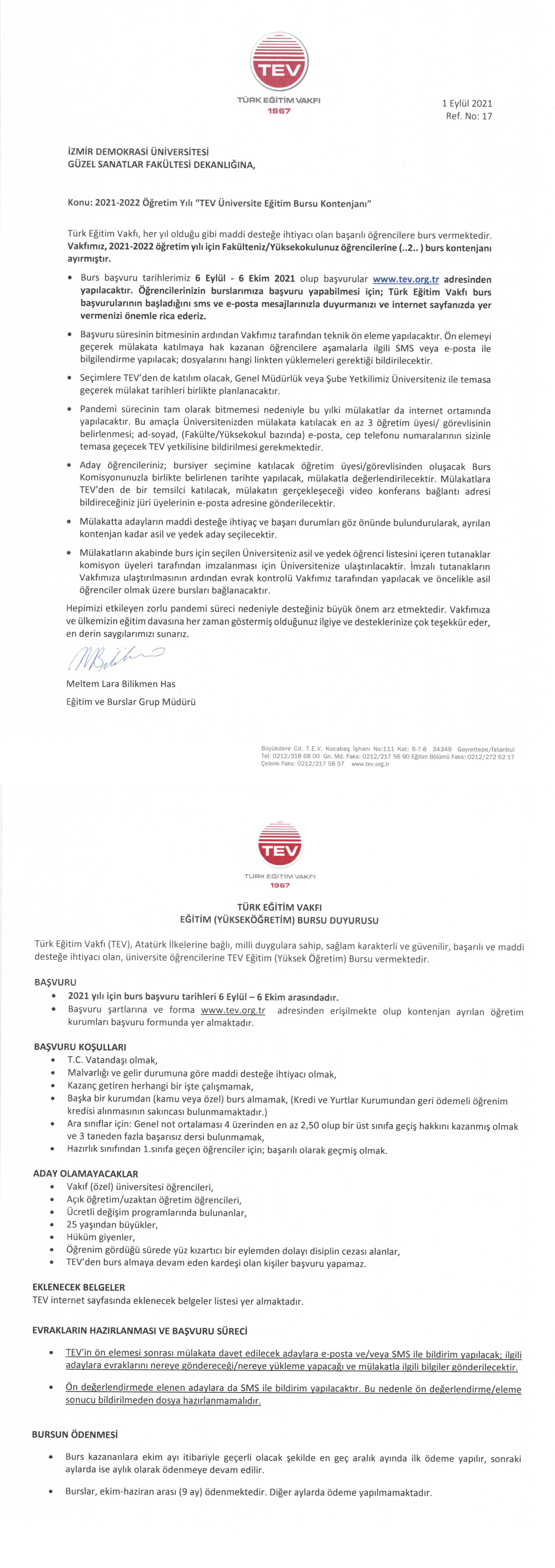 Türk Eğitim Vakfı (TEV) tarafından sağlanacak eğitim bursuna başvuru ile ilgili bilgilere buradan ulaşabilirsiniz.